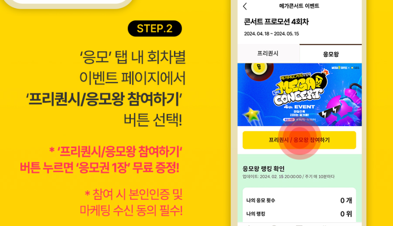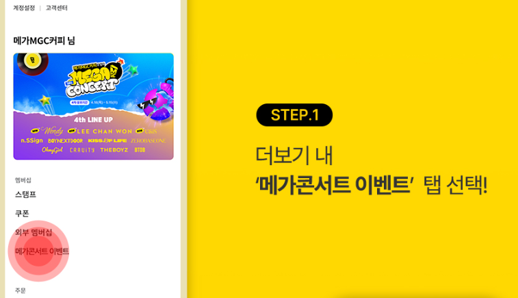 메가커피 콘서트티켓 응모 방법은 메가 MGC 앱 커피에서만 단독 제공됩니다.