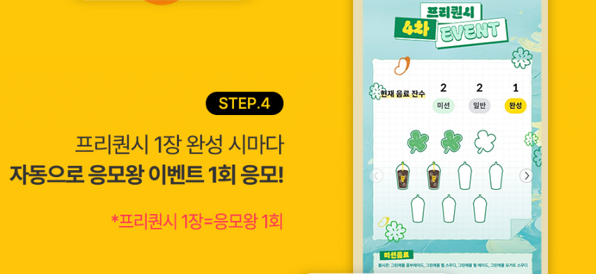 제조 음료 총 10잔(미션 음료 3잔 포함) 마시면 메가콘서트 1회 자동 응모! (당첨 시 1인 2매 제공)