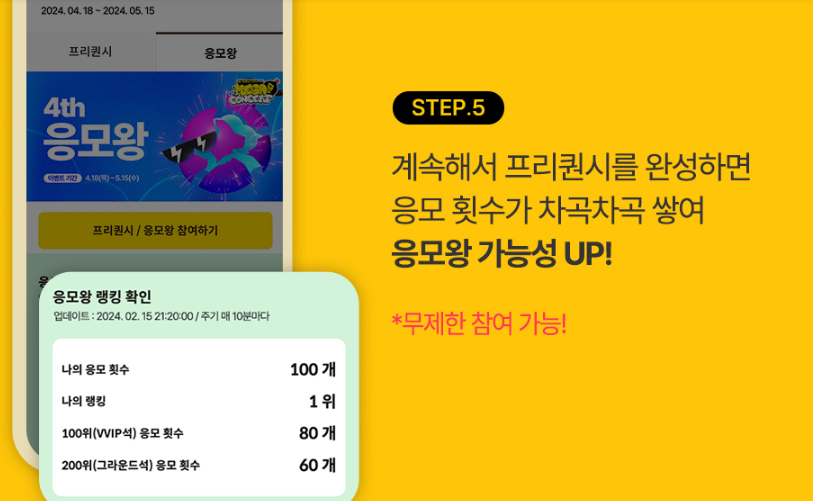 프리퀀시 이벤트를 가장 많이 응모한 순서로 VVIP, 그라운드석 티켓 100% 당첨! (당첨 시 1인 1매 제공)