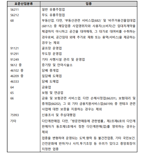 ▪ 신용보증재단 재보증 제한업종 해당업체 예) 도박, 유흥, 금융 등