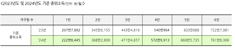 2024년 기준 중위소득 금액 정리 (생계급여, 의료급여, 주거급여, 교육급여 소득 기준)
