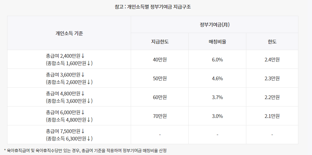 개인 소득 구간에 따라 정부에서 매달 최대 2.1만 원~2.4만 원의 기여금을 지급하며, 최대 6% 금리의 은행