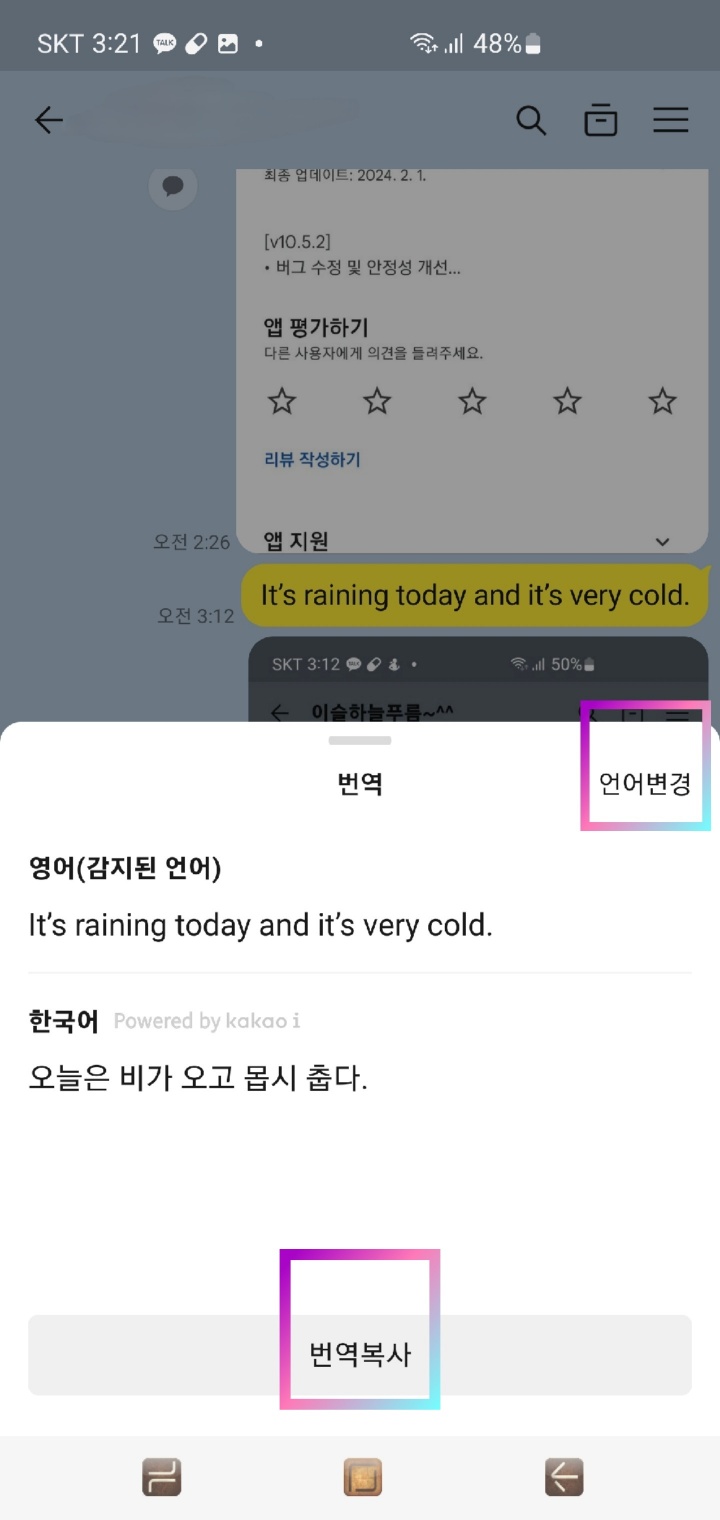 채팅방에서 외국어 채팅 텍스트을 꾹 길게 누릅니다. (번역복사로 클립보드에 복사할 수도 있습니다) >>