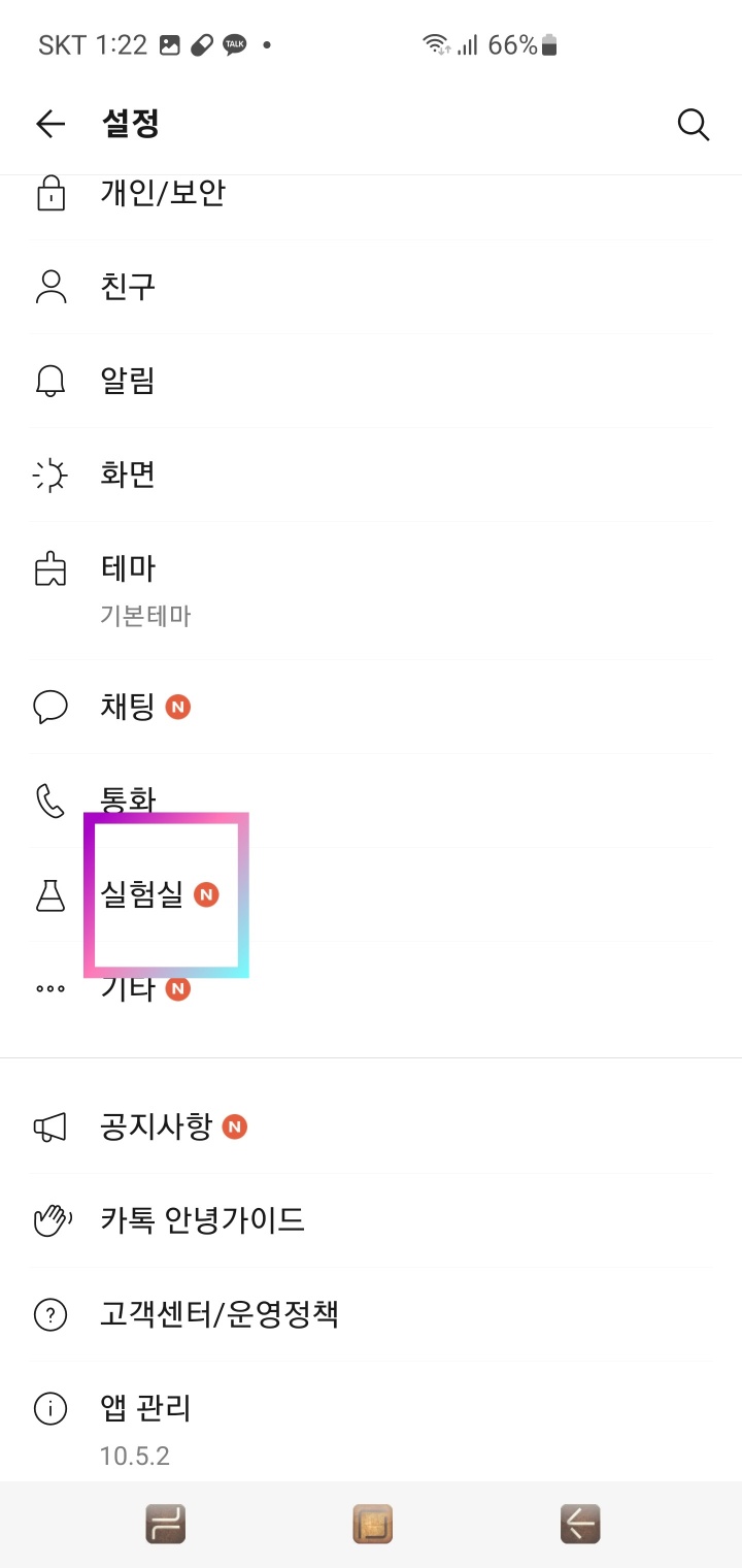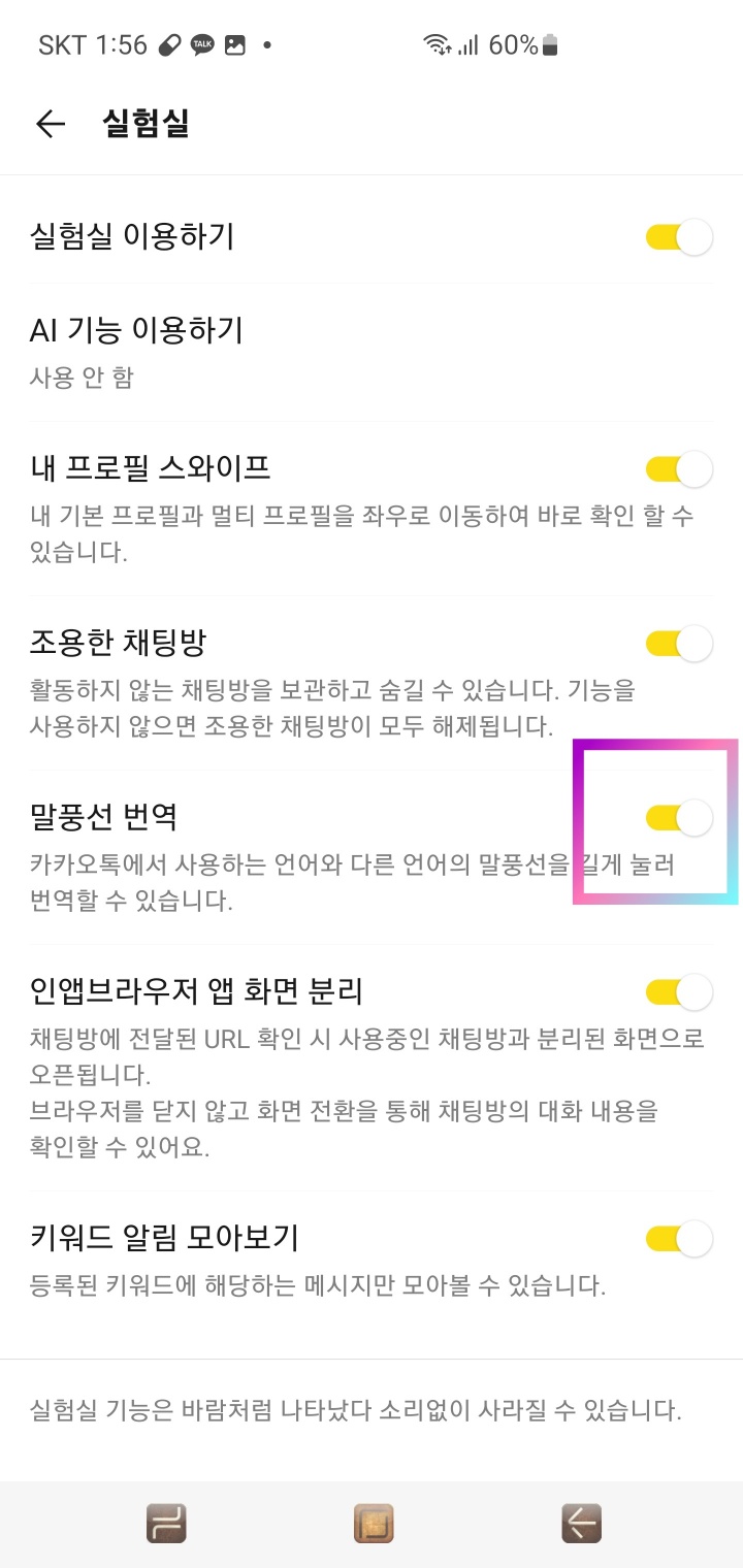 카카오톡 버전이 10.5.2 이상이라면, 실험실 이용과 번역을 활성화합니다.