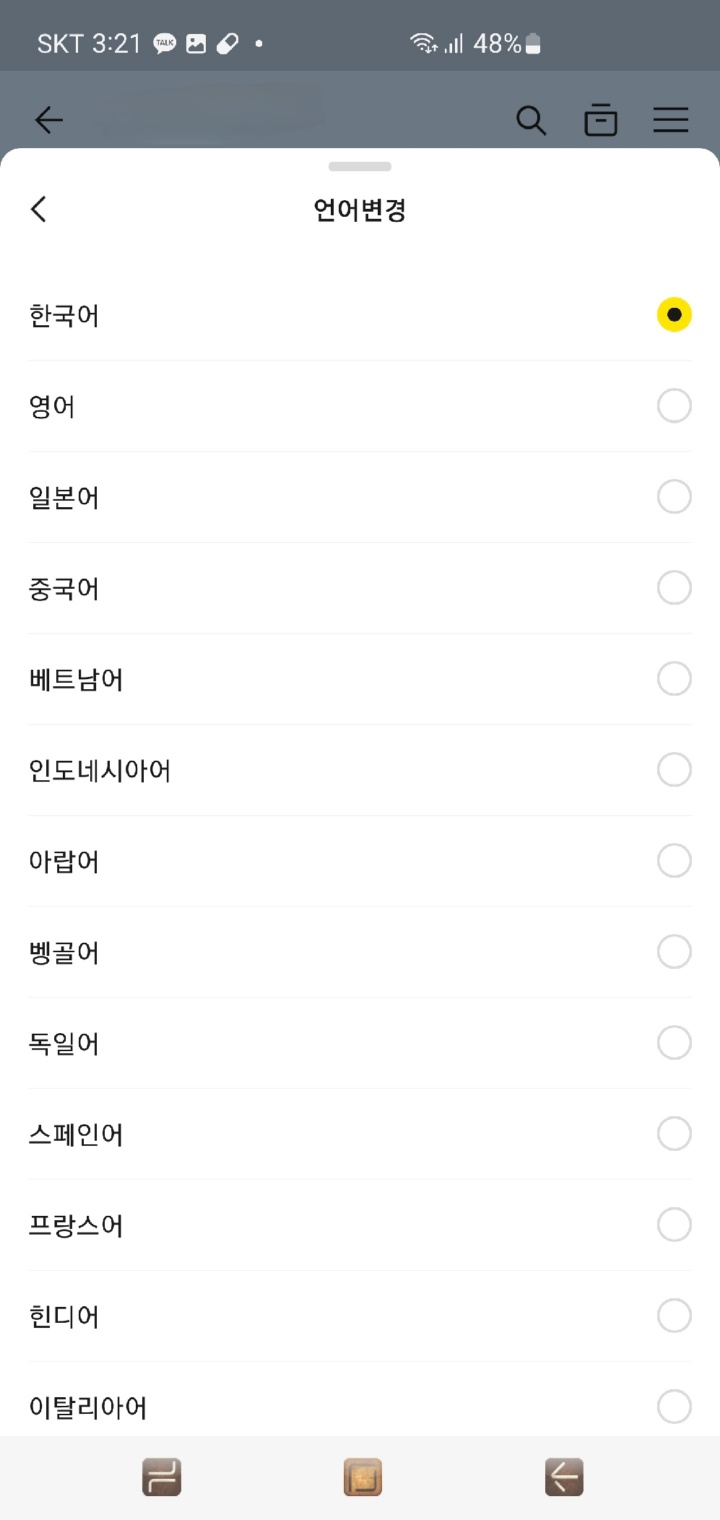 들어가면 언어의 종류도 많습니다. 별도의 프로그램을 사용하거나 깔지 않고 카톡 안에서 번역이 즐겁습니다.