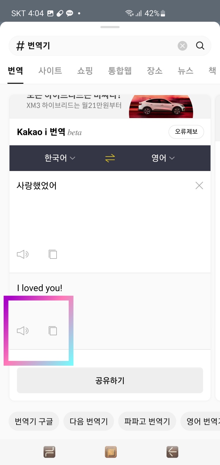 면 번역된 내용의 소리를 들을 수 있습니다. 그리고 오른쪽 복사 버튼을 누르면 클립보드에 번역한 내용이