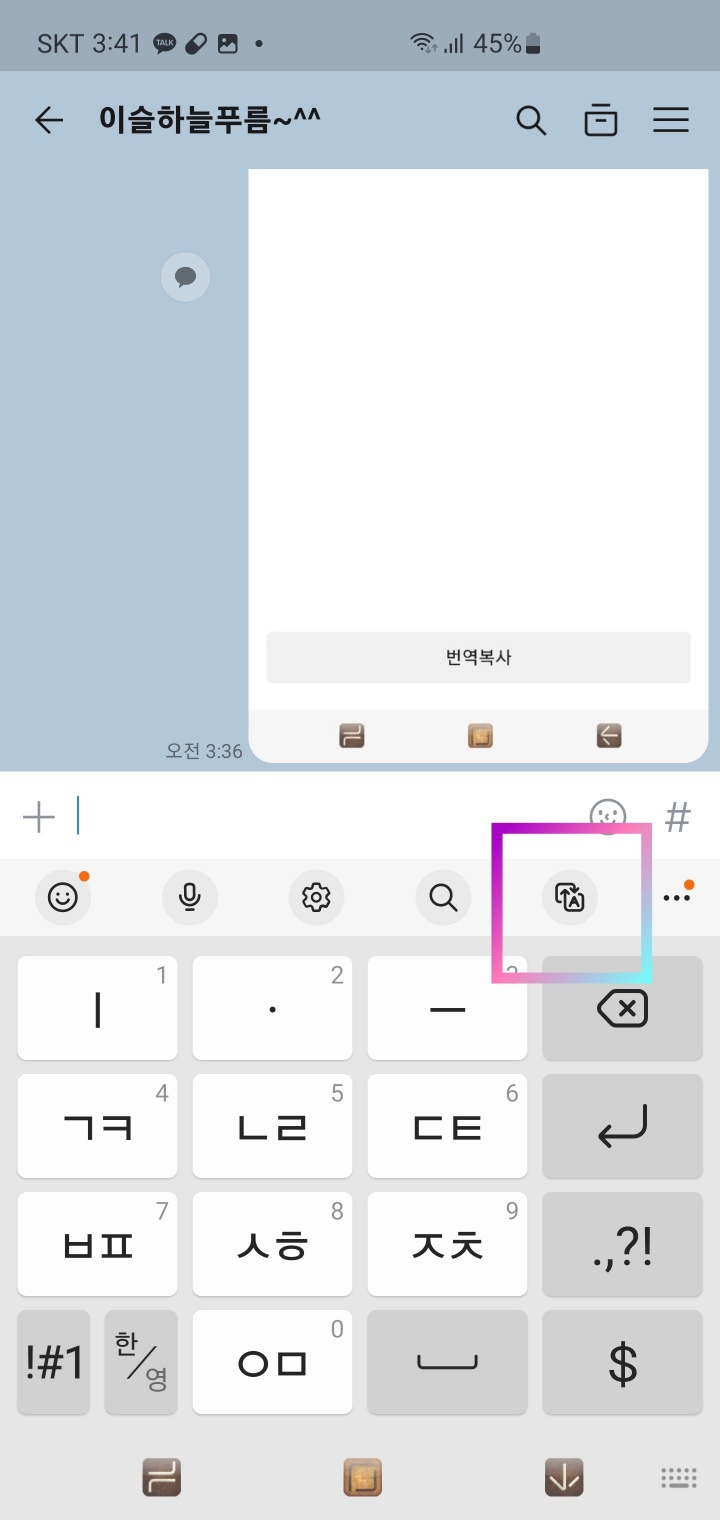 먼저 카카오톡 문자에 A를 터치합니다. >> 번역할 텍스트를 입력을 하고 자판에 A아이콘을