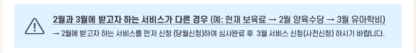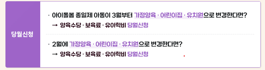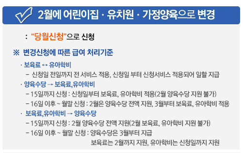 2월에 가정약육, 어린이집, 유치원으로 변경한다면>> 양육수당, 보육료, 유아학비 당월신청